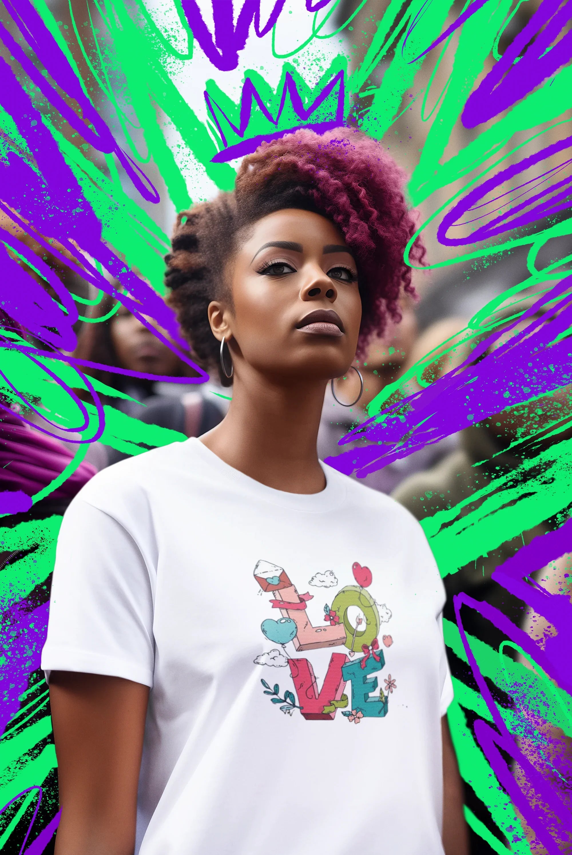 Diseño único y vibrante que mezcla la palabra “Love” con una explosión de colores y formas.