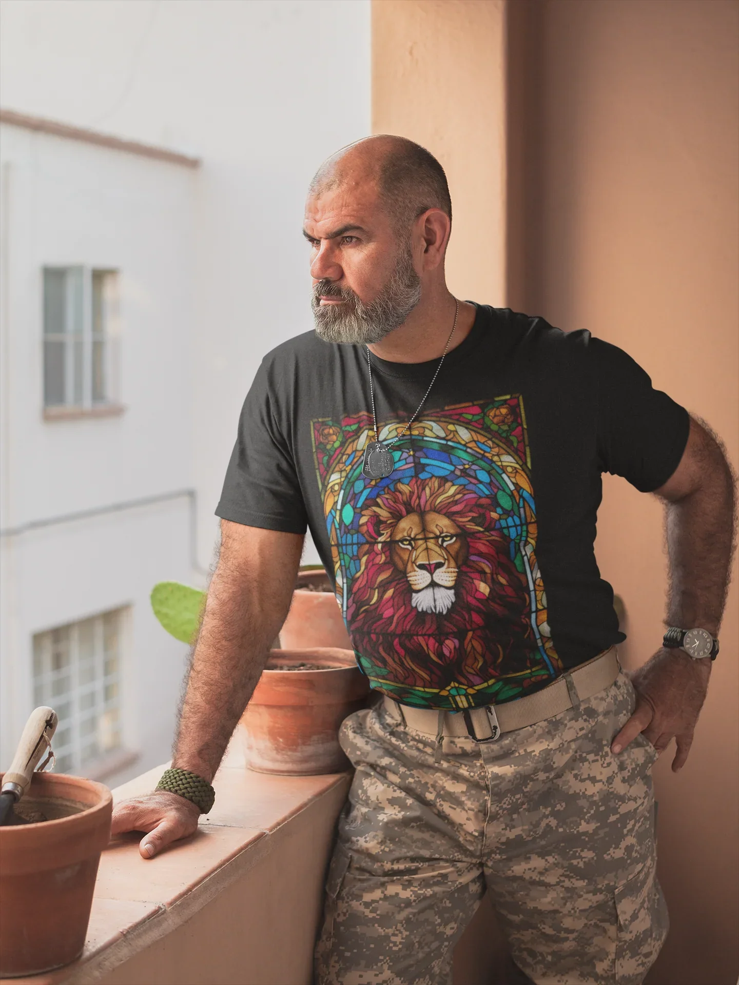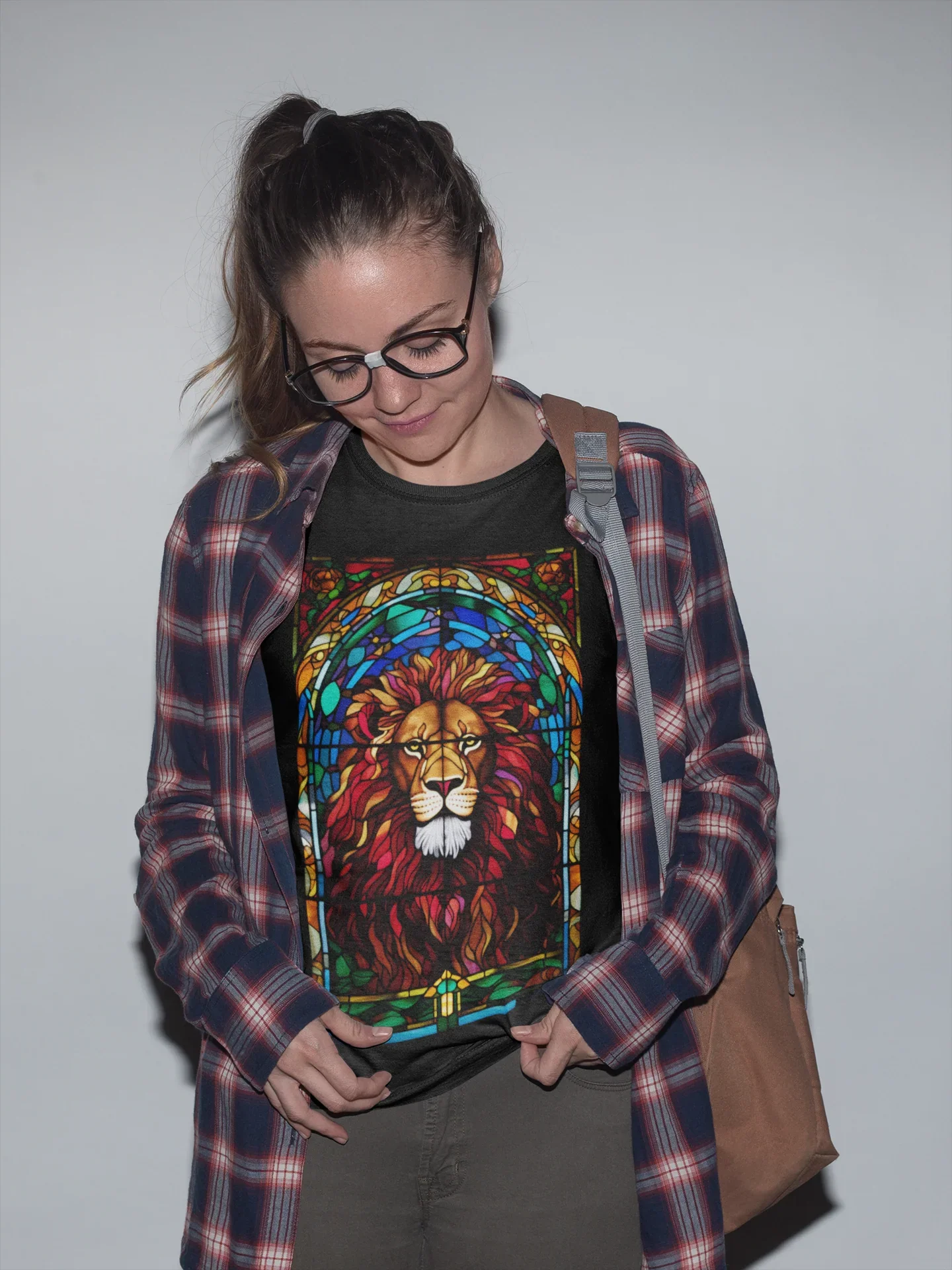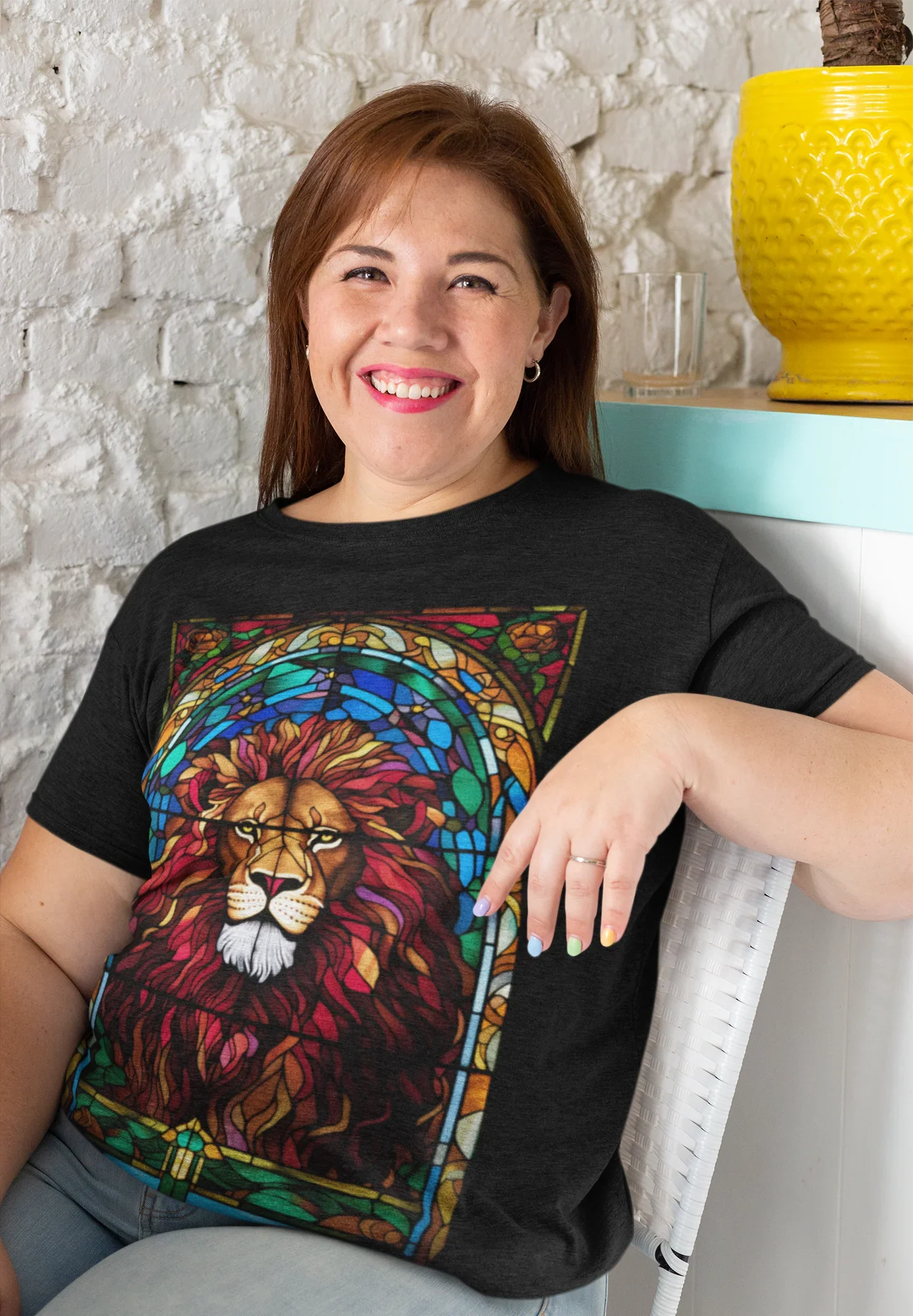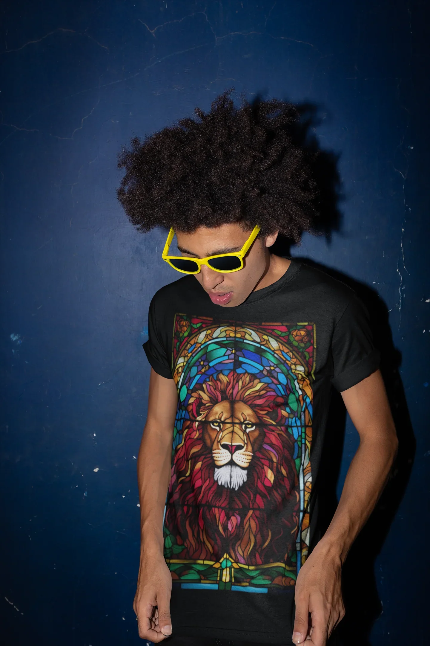 Diseño artístico que une la fuerza del León de Judá con la belleza simbólica de los vitrales.